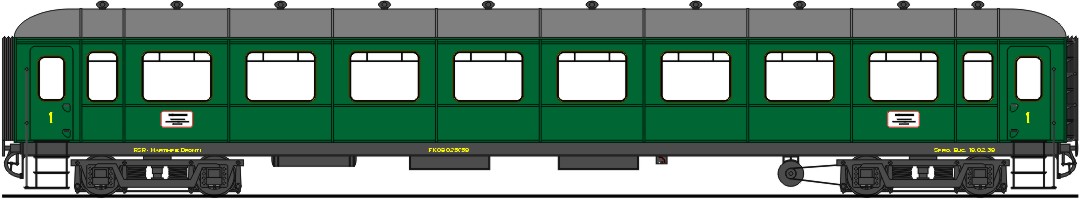 The avant-garde series of coaches designed by Jochann Dugehrie in 1935 did not find favour with all the travelling public. Complaints about weird shapes and quaint styling abounded. So it was that with heavy heart Dugehrie set about producing a series of new stock of much more staid appearance. The interiors were still modern by the standards of the day but less trendy, as one would say today. Certainly they offered the ultimate in travelling comfort, with reclining seats, air-conditioning and lightweight alloy fittings. The monocoque coachwork was abandoned, increasing the weight per coach to some 35 tonnes. The Commonwealth bogies, concertina corridor gangways and dynamo-driven lighting of the 1935 stock were retained. The 1938 stock, being quite sturdily built, survived the hostilities reasonably well and served the RSR for many more years, the last examples being taken out of service in the late 1980s.